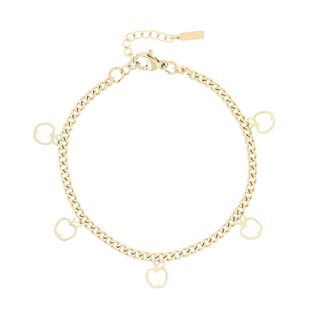 OOZOO Jewellery is a great addition to your personal accessories collection. This beautiful gold coloured bracelet with apples is the perfect ladies accessory to complete your outfit. The bracelet is 17 cm long and is 3 cm adjustable. This amazing piece is made of strong stainless steel with gold coloured plated PVD and therefore long-lasting. This material ensures you that your jewellery retains its beautiful color. This product (SB-1043) is covered by a 3 months warranty (see section 3 of our Refund, shipping & warranty policy).