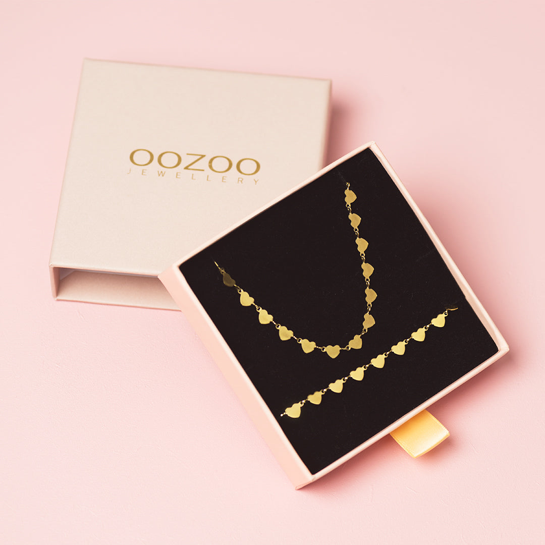 An OOZOO Jewellery set is an amazing gift for someone you cherish or just as a present to yourself! This beautiful gold coloured set of matching necklace and bracelet with hearts is the ultimate combination. The necklace is 40 cm long (+8 cm adjustable) and the bracelet is 17 cm long (+3 cm adjustable). These amazing pieces are made of stainless steel with gold coloured plated PVD and therefore long-lasting. This material ensures you that your jewellery retains its beautiful color. These products (SN-2013 & SB-1013) are covered by a 3 months warranty period (see section 3 of our Refund, shipping & warranty policy).
