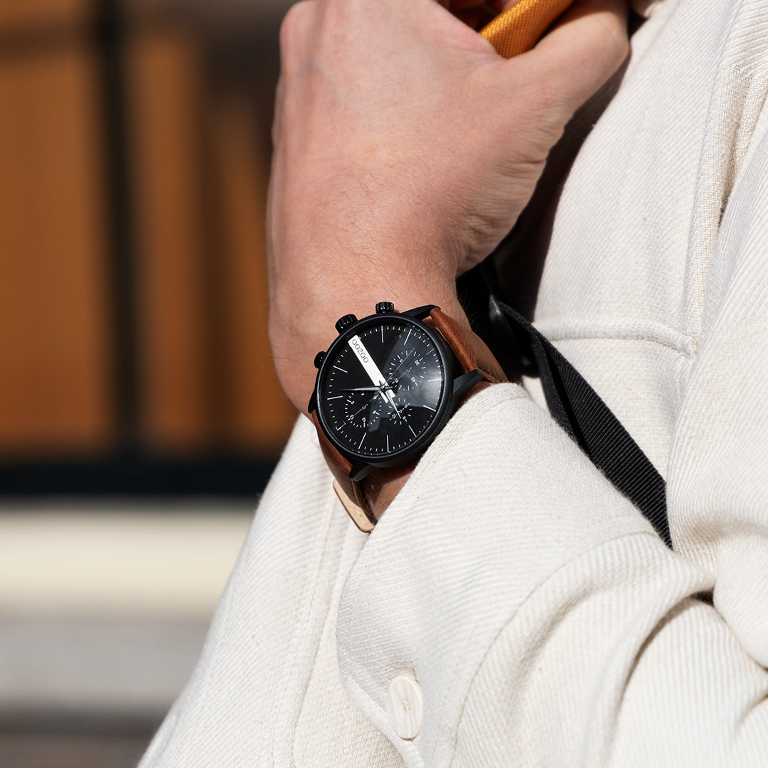 Stand out with this beautiful round gents design from the trendy OOZOO Timepieces collection. The C11223 has a stitched brown leather strap and 45 mm black matte watch case. You are making quite the fashion statement with this black chrono dial, silver coloured stripes digits and matching hands. This essential watch for your wardrobe has a mineral glass, stainless steel backplate and is nickel safe. This watch has a 2ATM Japanese movement and is covered by a 2 year warranty (see section 3 of our Refund, shipping & warranty policy).