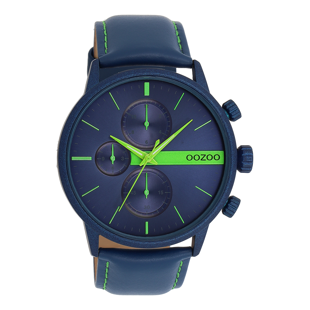 Stand out with this beautiful round gents design from the trendy OOZOO Timepieces collection. The C11228 has a stitched blue leather strap and 45 mm blue matte watch case. You are making quite the fashion statement with this blue chrono/sunray dial, fluo green stripes digits and matching hands. This essential watch for your wardrobe has a mineral glass, stainless steel backplate and is nickel safe. This watch has a 2ATM Japanese movement and is covered by a 2 year warranty (see section 3 of our Refund, shipping & warranty policy).