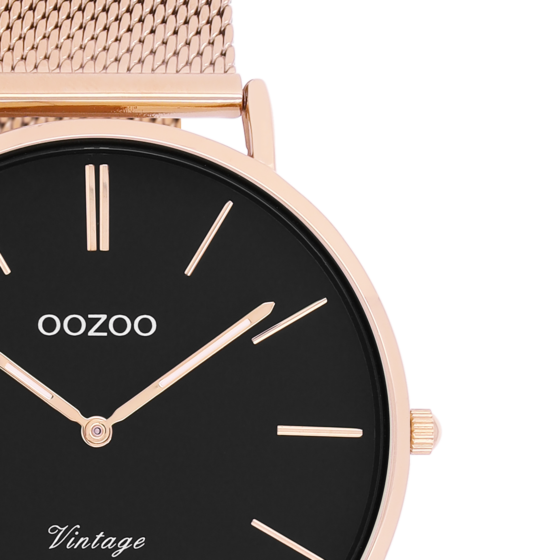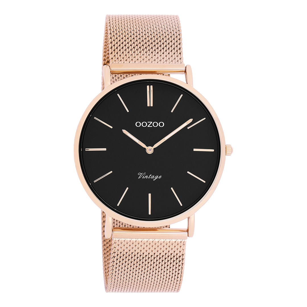 Sophistication and elegance are two elements of our beautiful OOZOO Vintage Classics. This classic round design with a contemporary twist is something for everyone. This unisex watch is the perfect combination of comfort and fashion with its 40 mm rose coloured metal watch case and black dial. The rose coloured metal mesh bracelet makes this watch an all-time classic which you can wear with every occasion. The dial has rose coloured stripes digits and matching hands. The C9925 is a must have for your every-wear. The mineral glass lays in a 6,9 mm slim metal watch case with IP-plating. This design has a stainless steel backplate and is nickel safe. This watch has a 2ATM Japanese movement and is covered by a 2 year warranty (see section 3 of our Refund, shipping & warranty policy).