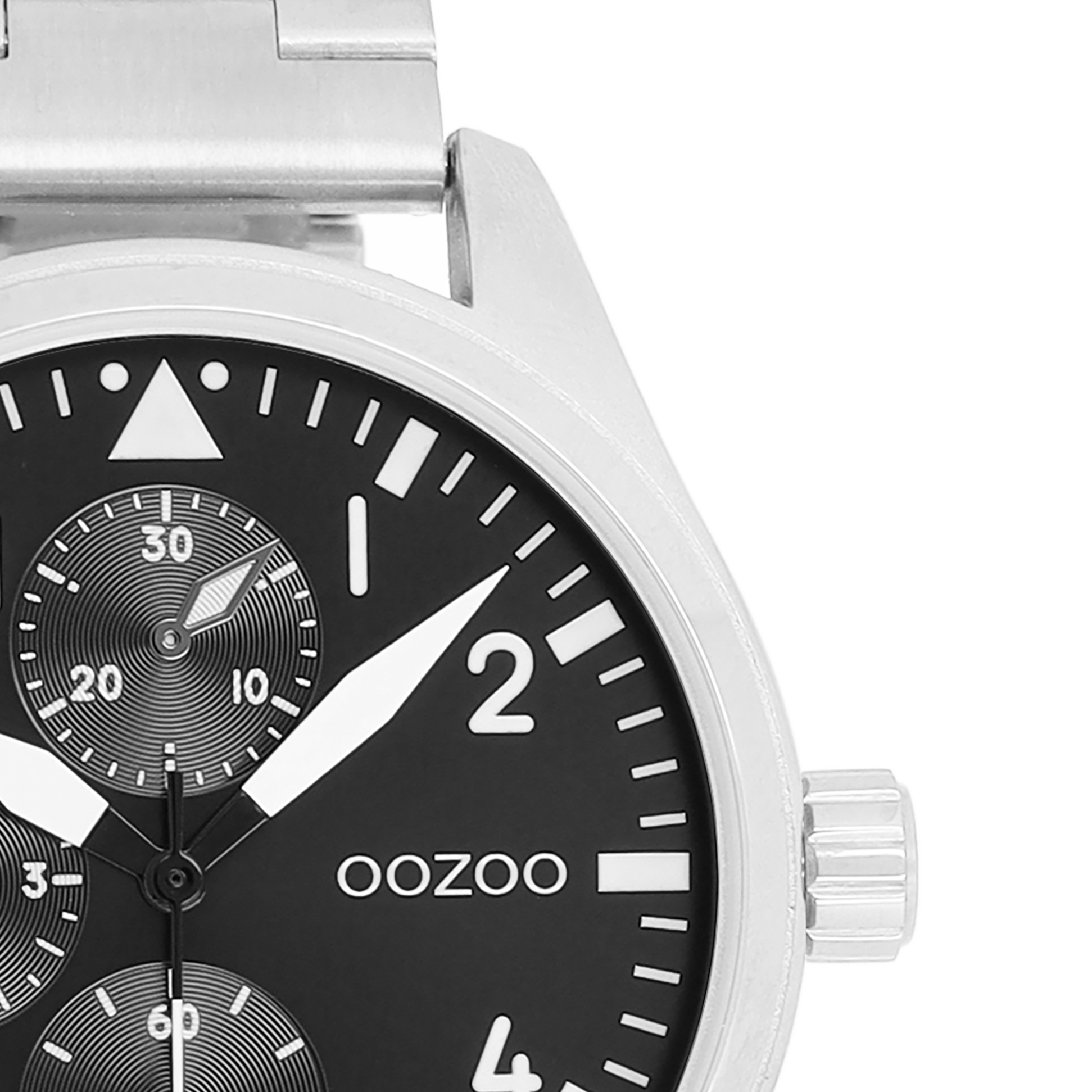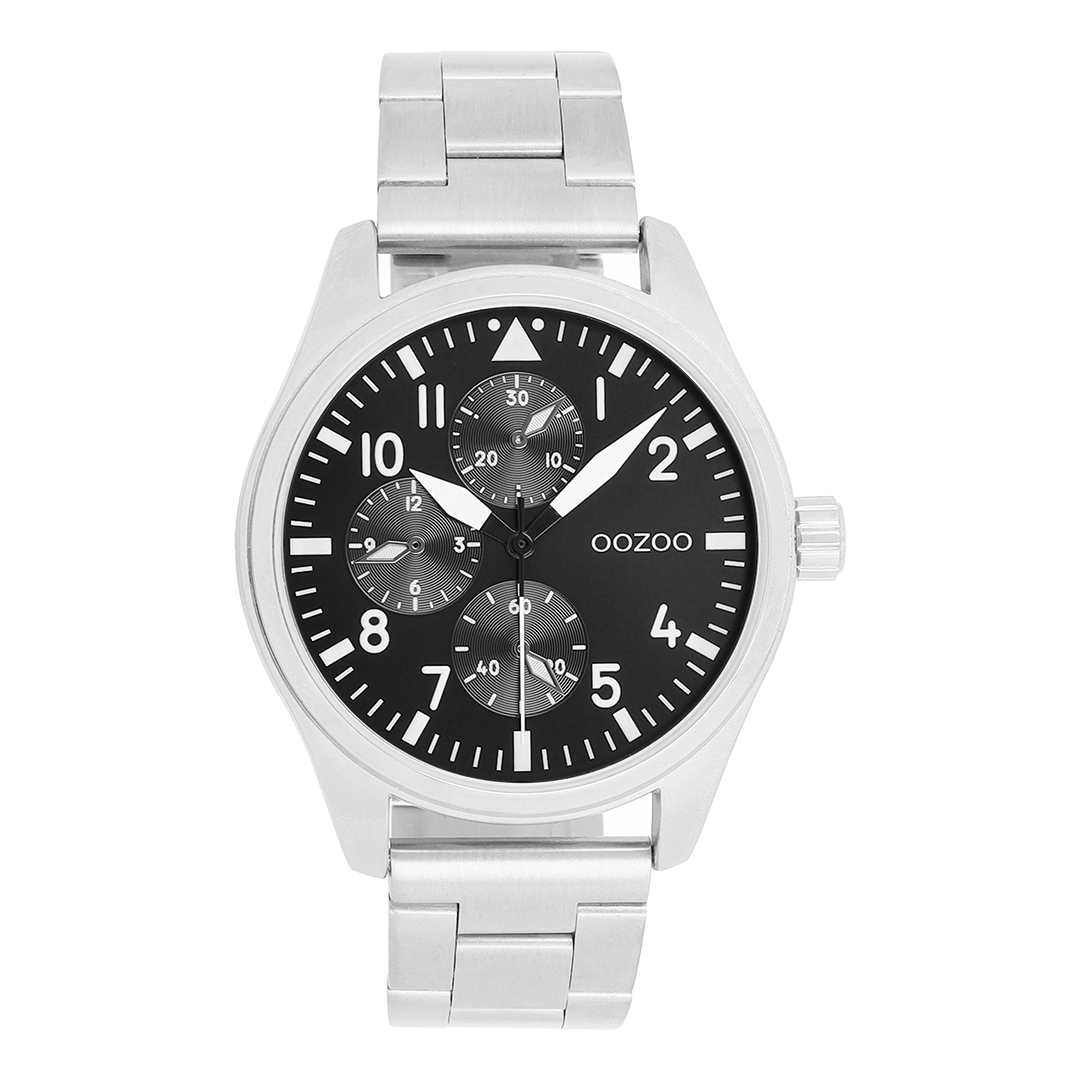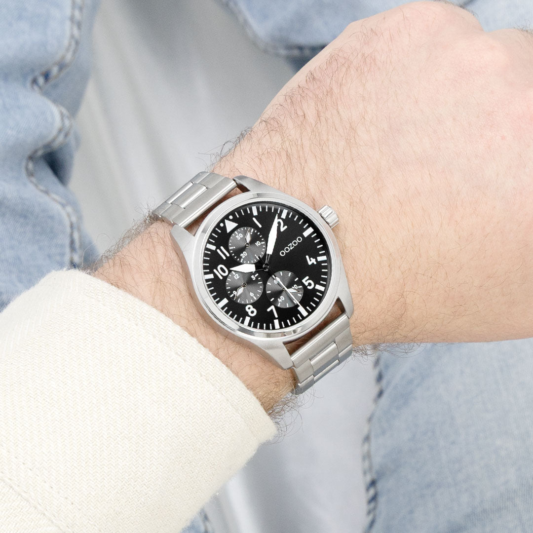 Stand out with this beautiful round gents design from the trendy OOZOO Timepieces collection. The C11506 has a matte silver coloured stainless steel bracelet and 42 mm silver coloured metal watch case. You are making quite the fashion statement with this black chrono dial, white stripes and numbers digits and white/black hands. This essential watch for your wardrobe has a mineral glass, stainless steel backplate and is nickel safe. This watch has a 2ATM Japanese movement and is covered by a 2 year warranty (see section 3 of our Refund, shipping & warranty policy).