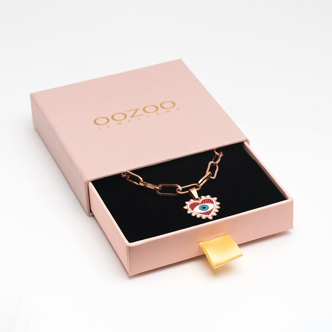 OOZOO Jewellery is a great addition to your personal accessories collection. This beautiful rose coloured necklace with evil eye charm is the perfect ladies accessory to complete your outfit. The necklace is 44 cm long and is 8 cm adjustable. This amazing piece is made of strong stainless steel with rose coloured plated PVD and therefore long-lasting. This material ensures you that your jewellery retains its beautiful color. This product (SN-2020) is covered by a 3 months warranty (see section 3 of our Refund, shipping & warranty policy).
