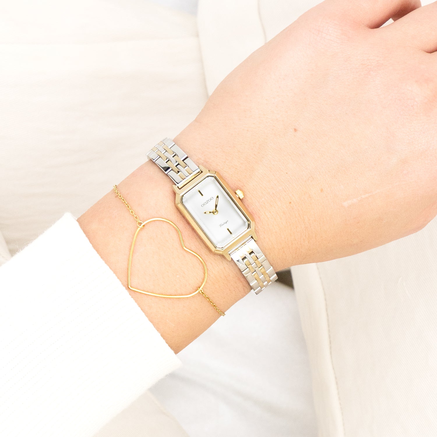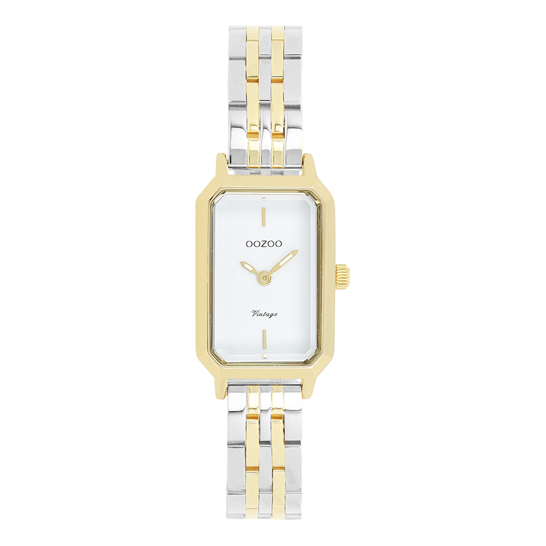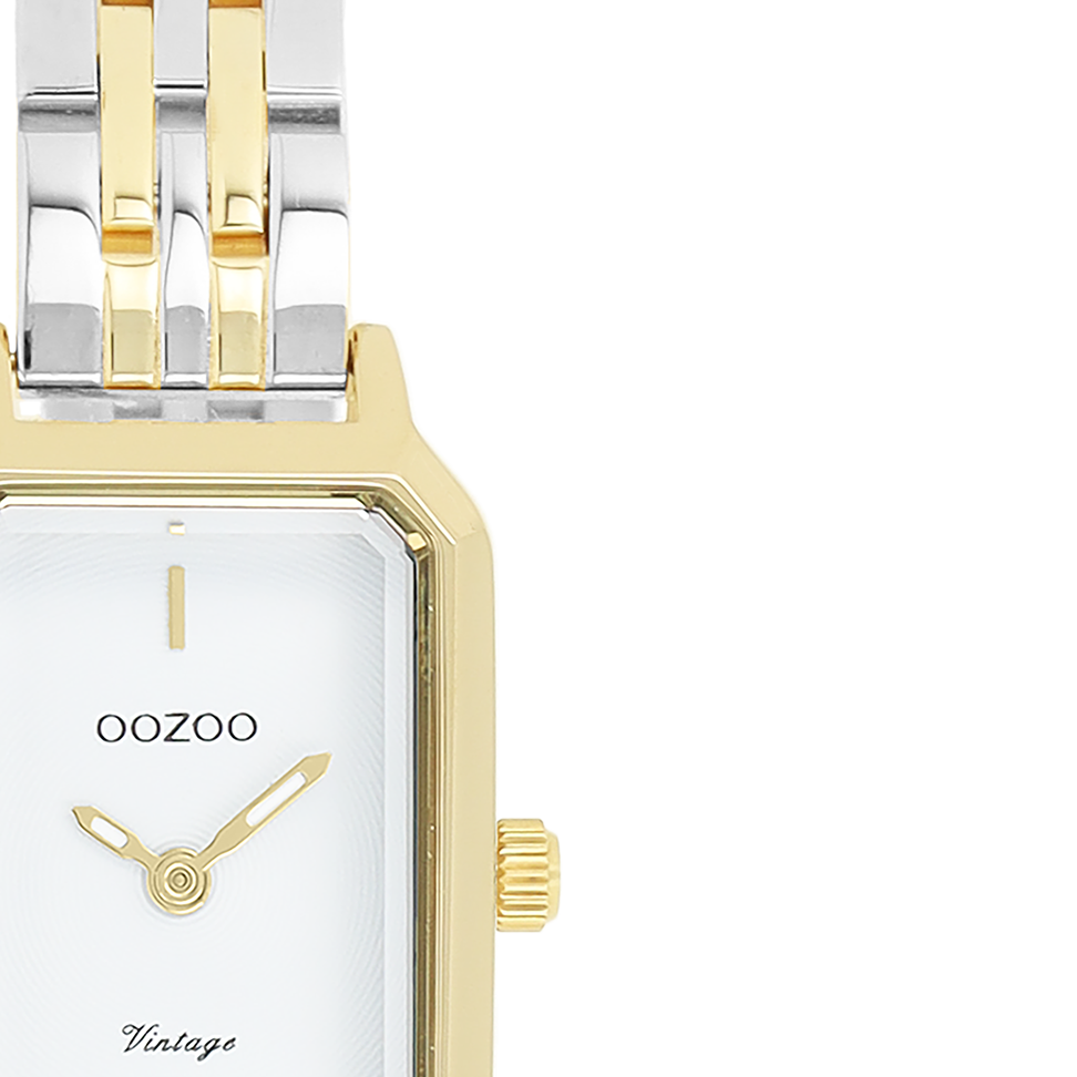 The classic look stays key in this trendy series and therefore, this rectangular OOZOO vintage design with a playful wink is the season must-have! This ladies watch is the perfect combination of fashion and comfort with its 22x19 mm gold coloured metal watch case and white circle pattern dial. The bicolor silver coloured/gold leather strap makes this watch a trendy accessory, which you can wear every day. The dial has gold coloured stripes digits and matching hands. The C20454 adds the sparkle to your outfit. The mineral glass lays in a 9,5 mm slim metal watch case with IP-plating. This design has a stainless steel backplate and is nickel safe. This watch has a 2ATM Japanese movement and is covered by a 2 year warranty (see section 3 of our Refund, shipping & warranty policy).