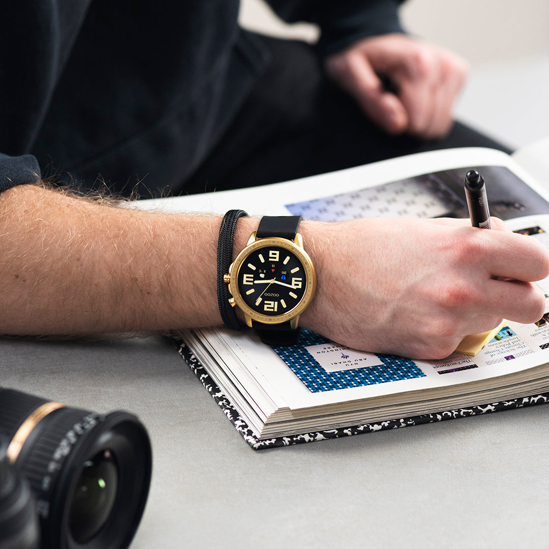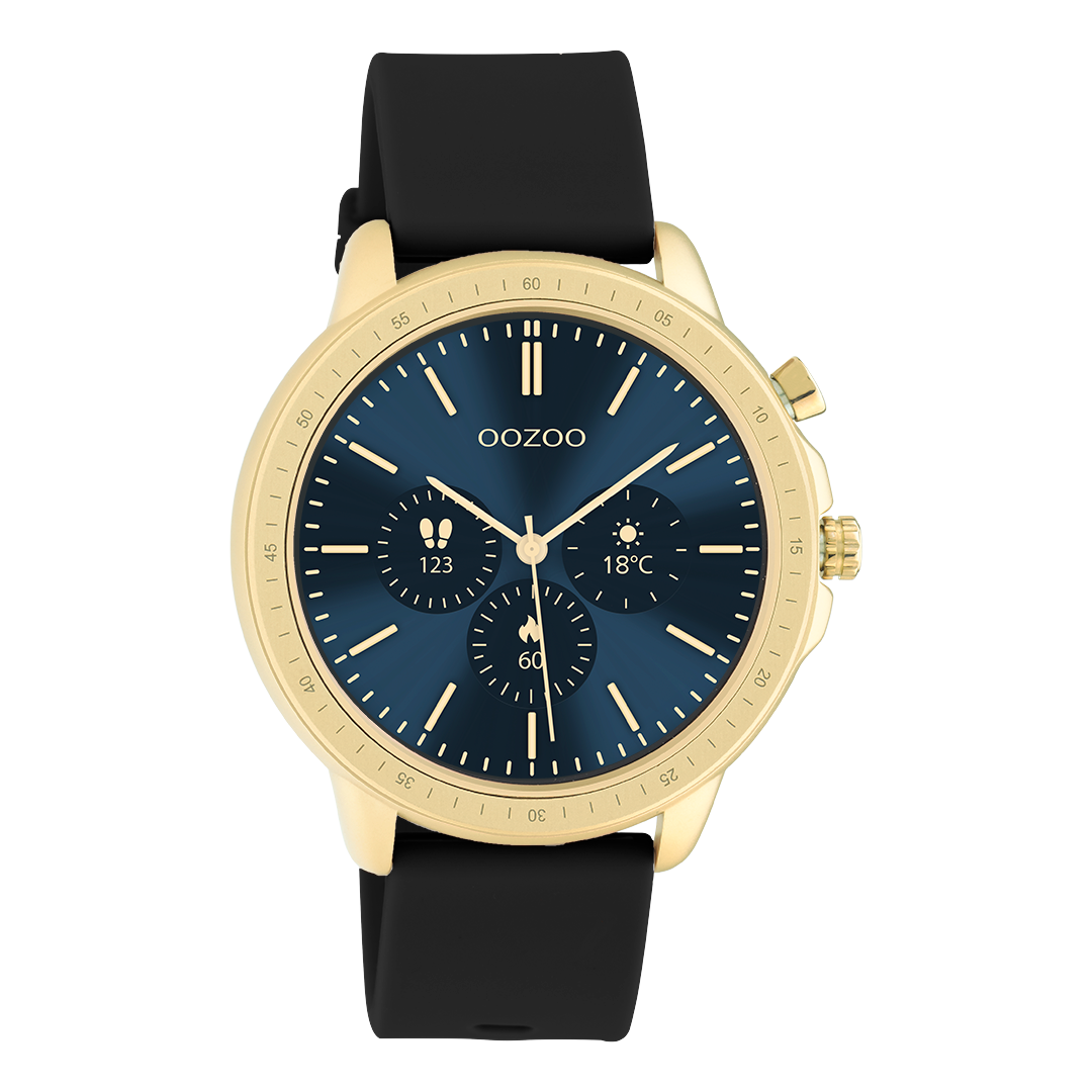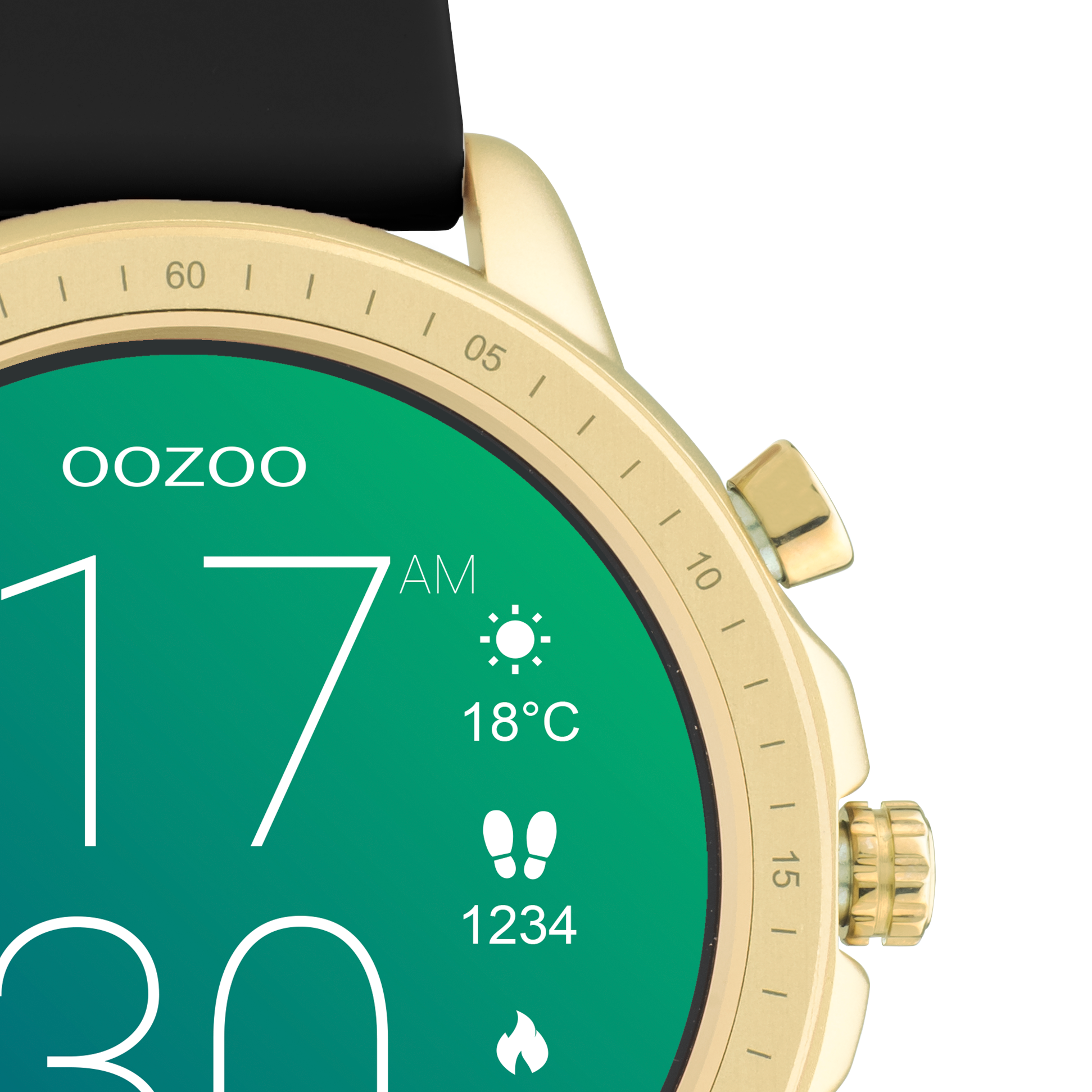 Get smart with us! This unisex smartwatch from OOZOO's digital collection has a round watch case. The Q00301 is one of our most elegant designs in our OOZOO Smartwatches collection with its 45 mm gold coloured metal watch case. This essential accessory has a beautiful matte black rubber strap with clasp. This smartwatch has different styles of colorful digital OOZOO dials to choose or make your own unique creation for its full touch screen. The mineral glass lays in a 11,4 mm thick watch case and has a plastic backplate and is nickel safe. A charger is included with this product. This smartwatch is IP67 certified and is covered by a 2 year warranty (see section 3 of our Refund, shipping & warranty policy).