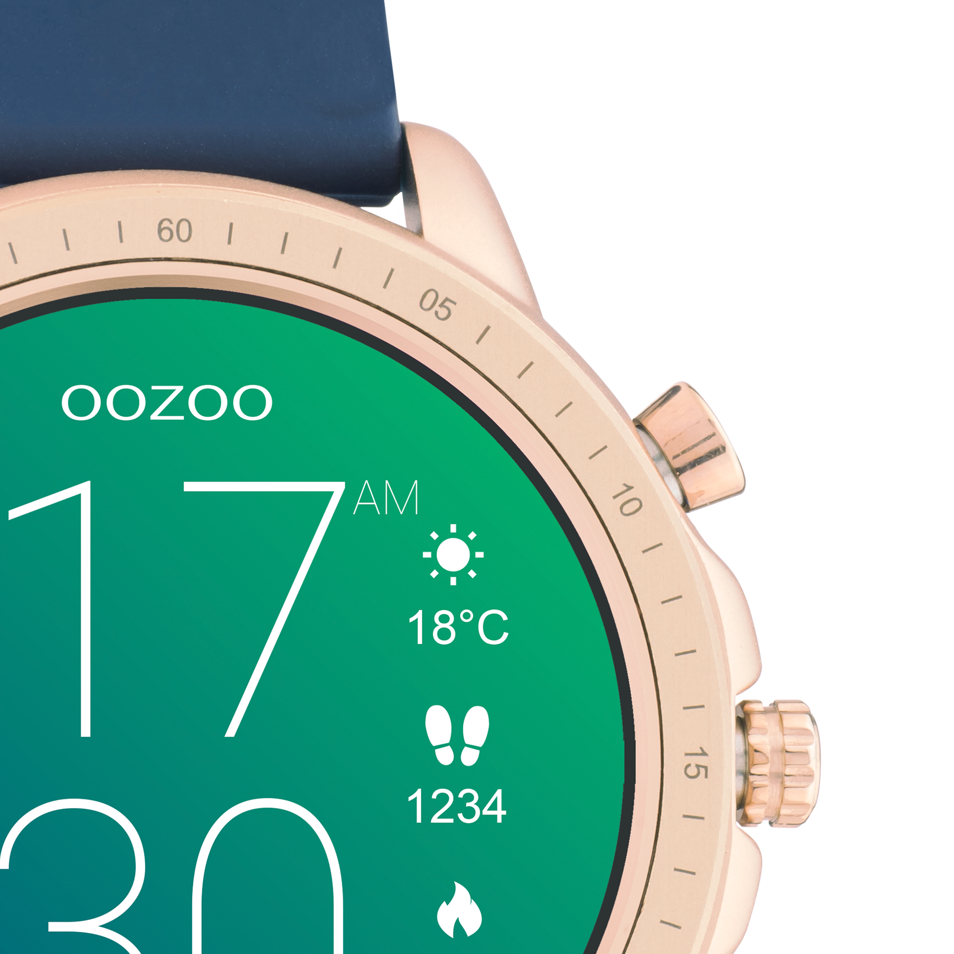 Get smart with us! This ladies smartwatch from OOZOO's digital collection has a round watch case. The Q00326 is one of our most elegant designs in our OOZOO Smartwatches collection with its 45 mm rose coloured metal watch case. This essential accessory has a beautiful matte dark blue rubber strap with clasp. This smartwatch has different styles of colorful digital OOZOO dials to choose or make your own unique creation for its full touch screen. The mineral glass lays in a 11,4 mm thick watch case and has a plastic backplate and is nickel safe. A charger is included with this product. This smartwatch is IP67 certified and is covered by a 2 year warranty (see section 3 of our Refund, shipping & warranty policy).