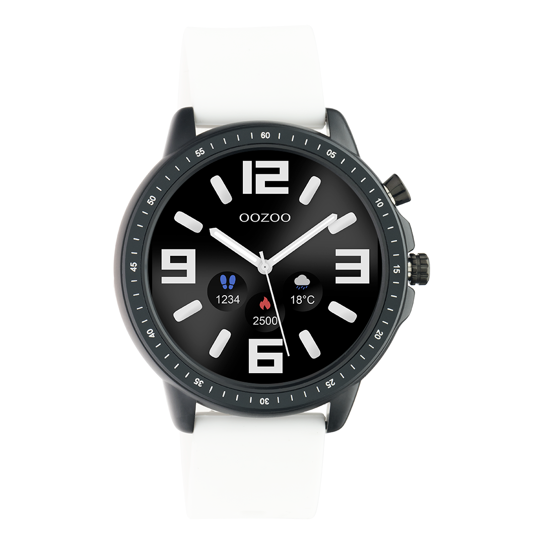 Get smart with us! This unisex smartwatch from OOZOO's digital collection has a round watch case. The Q00327 is one of our most elegant designs in our OOZOO Smartwatches collection with its 45 mm black metal watch case. This essential accessory has a beautiful matte white rubber strap with clasp. This smartwatch has different styles of colorful digital OOZOO dials to choose or make your own unique creation for its full touch screen. The mineral glass lays in a 11,4 mm thick watch case and has a plastic backplate and is nickel safe. A charger is included with this product. This smartwatch is IP67 certified and is covered by a 2 year warranty (see section 3 of our Refund, shipping & warranty policy).
