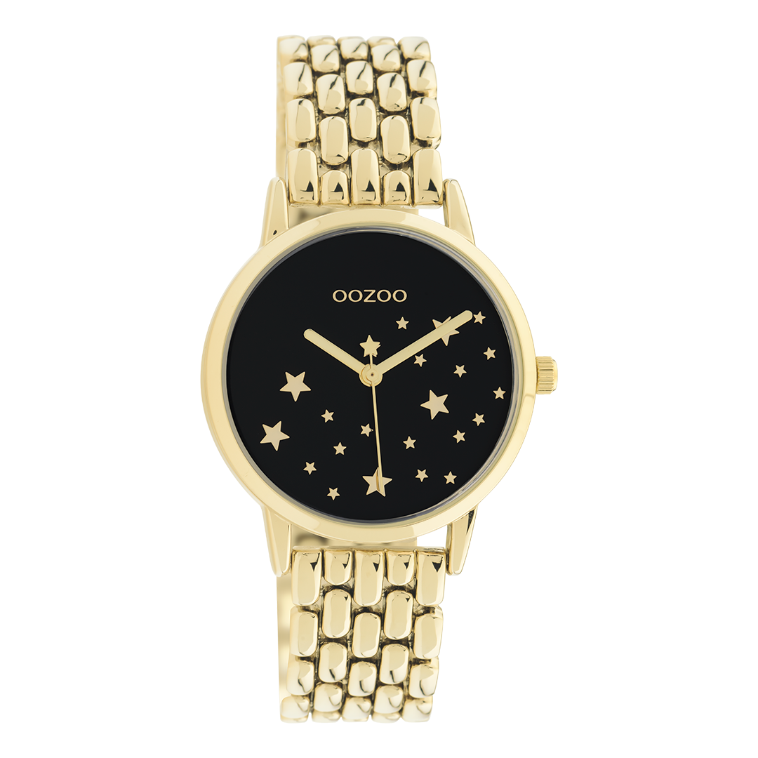 Stand out with this beautiful round ladies design from the trendy OOZOO Timepieces collection. The C11029 has a chained gold coloured stainless steel bracelet and 34 mm gold coloured metal watch case. You are making quite the fashion statement with this black stars dial, no digits and gold coloured hands. This essential watch for your wardrobe has a mineral glass, stainless steel backplate and is nickel safe. This watch has a 2 Japanese movement and is covered by a 2 year warranty (see section 3 of our Refund, shipping & warranty policy).