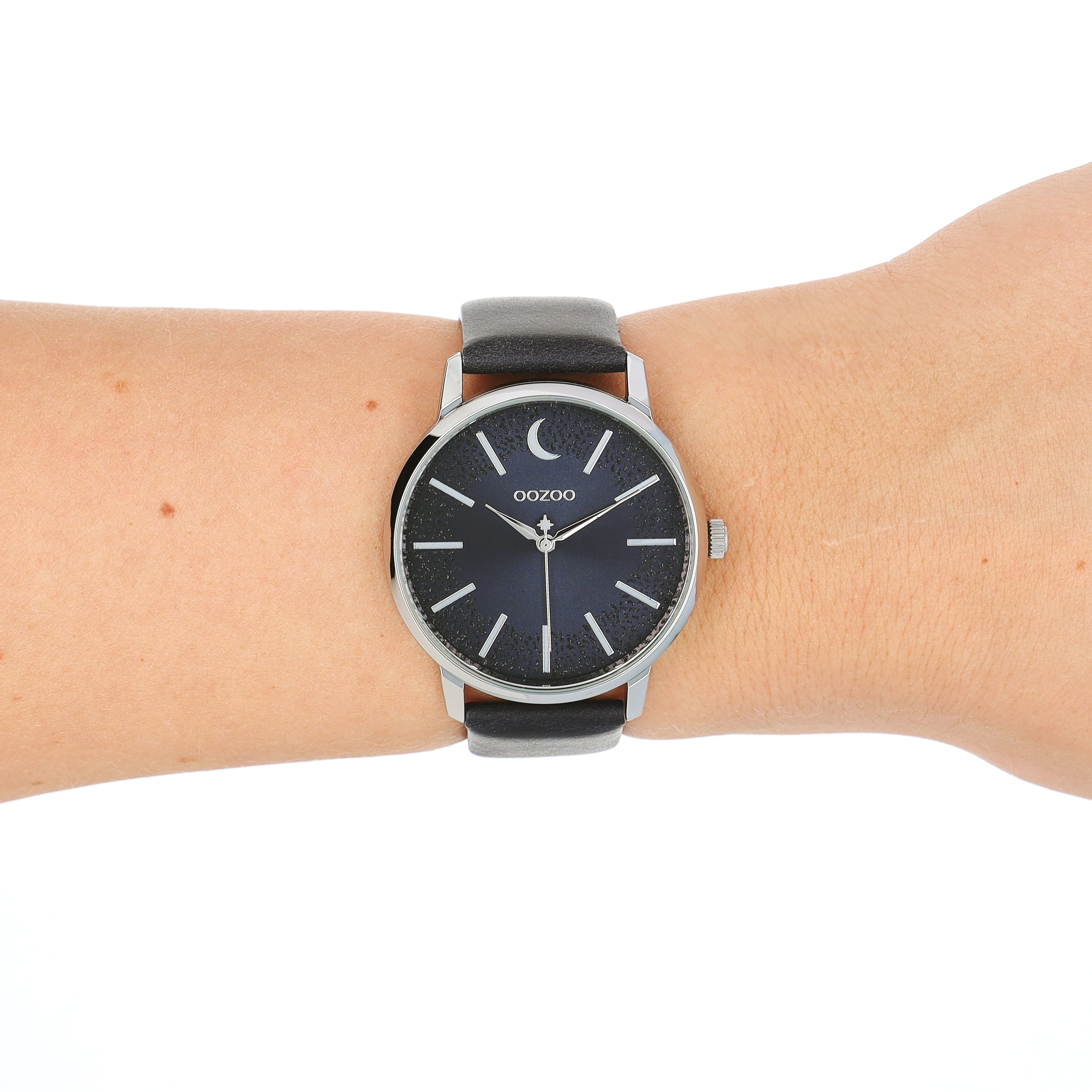 Stand out with this beautiful round ladies design from the trendy OOZOO Timepieces collection. The C11043 has a matte dark blue leather strap and 40 mm silver coloured metal watch case. You are making quite the fashion statement with this dark blue sparkling gradient dial, silver coloured stripes digits and silver coloured hands. This essential watch for your wardrobe has a mineral glass, stainless steel backplate and is nickel safe. This watch has a 2 Japanese movement and is covered by a 2 year warranty (see section 3 of our Refund, shipping & warranty policy).