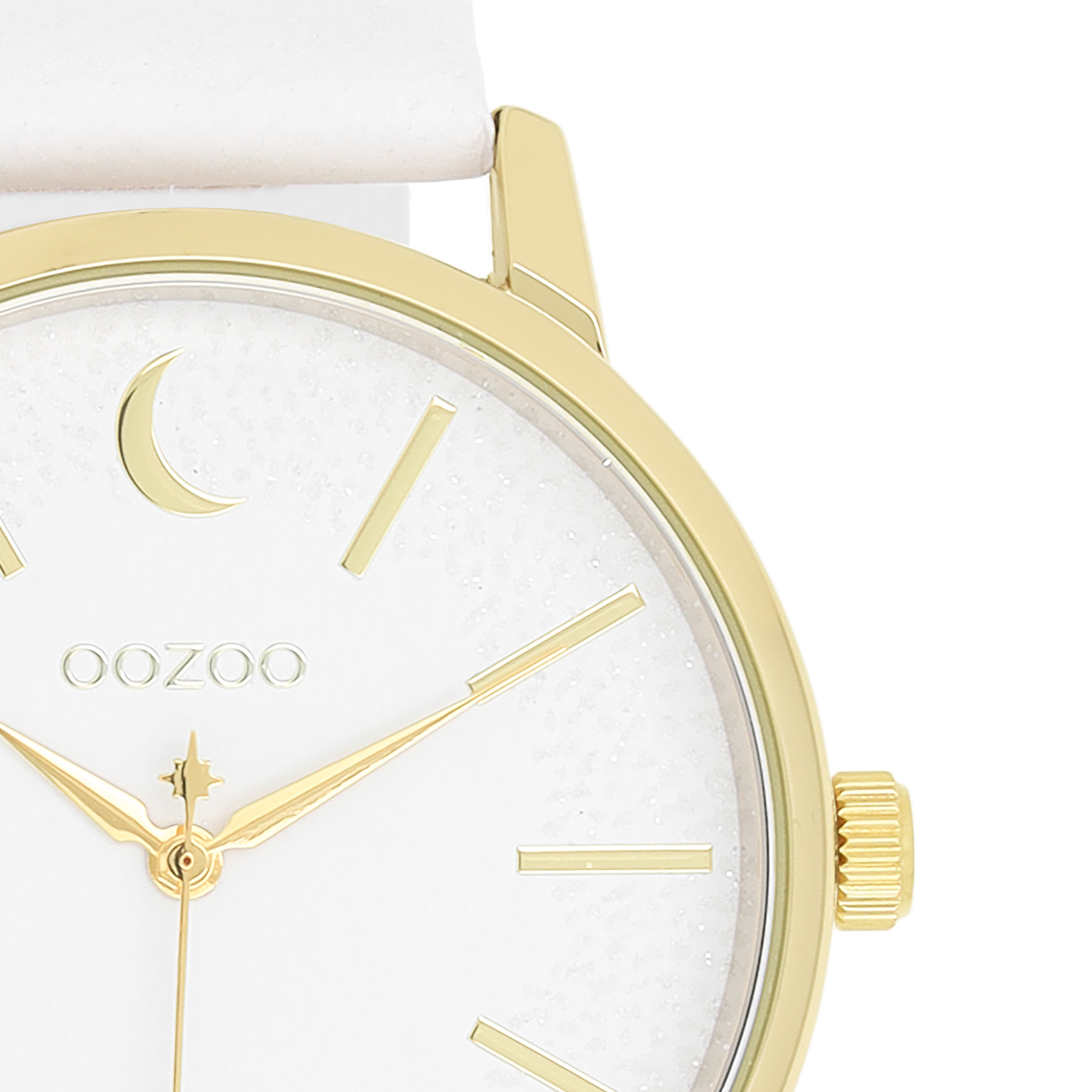 Stand out with this beautiful round ladies design from the trendy OOZOO Timepieces collection. The C11156 has a white leather strap and 40 mm gold coloured metal watch case. You are making quite the fashion statement with this white glitter dial, gold coloured stripes digits and matching hands. This essential watch for your wardrobe has a mineral glass, stainless steel backplate and is nickel safe. This watch has a 2 Japanese movement and is covered by a 2 year warranty (see section 3 of our Refund, shipping & warranty policy).