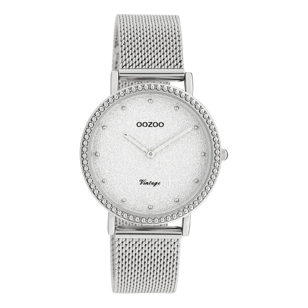 The classic look stays key in this trendy series and therefore, this round OOZOO vintage design with a playful wink is the season must-have! This ladies watch is the perfect combination of fashion and comfort with its 34 mm silver coloured metal watch case and silver coloured with sparkles dial. The silver coloured metal mesh bracelet makes this watch a trendy accessory, which you can wear every day. The dial has silver coloured dots digits and matching hands. The C20051 adds the sparkle to your outfit. The mineral glass lays in a 6,9 mm slim metal watch case with IP-plating. This design has a stainless steel backplate and is nickel safe. This watch has a 2 Japanese movement and is covered by a 2 year warranty (see section 3 of our Refund, shipping & warranty policy).