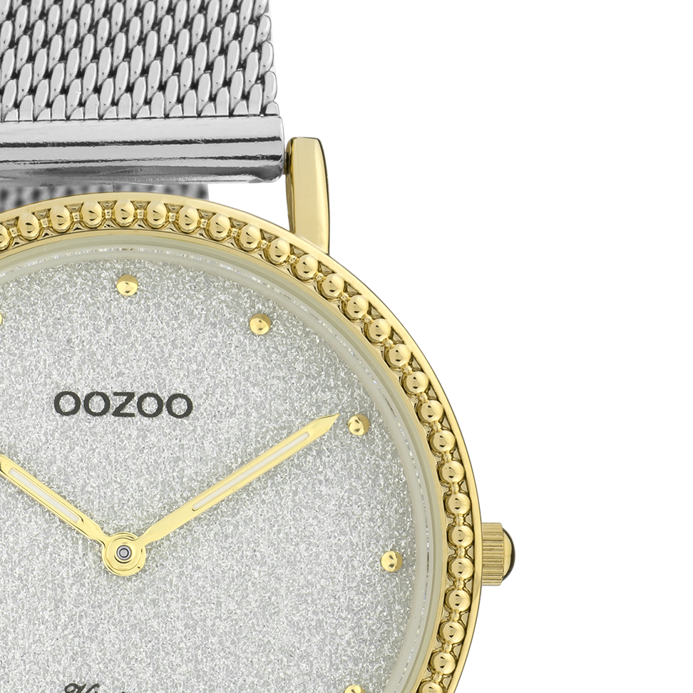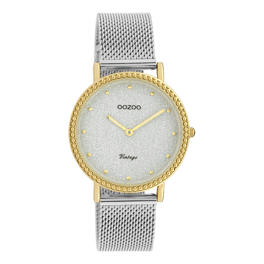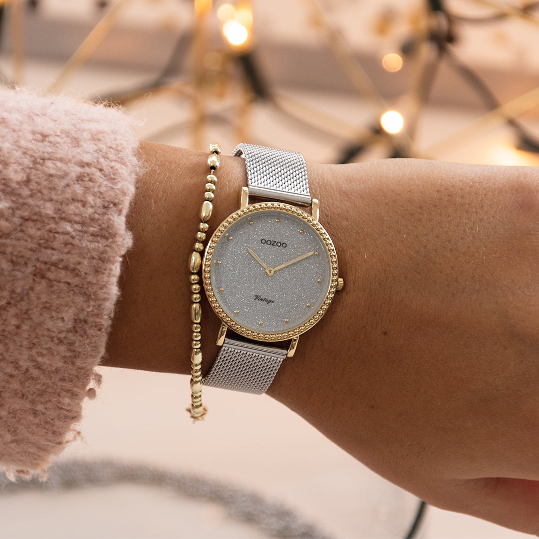 The classic look stays key in this trendy series and therefore, this round OOZOO vintage design with a playful wink is the season must-have! This ladies watch is the perfect combination of fashion and comfort with its 34 mm gold coloured metal watch case and silver coloured with sparkles dial. The silver coloured metal mesh bracelet makes this watch a trendy accessory, which you can wear every day. The dial has gold coloured dots digits and matching hands. The C20053 adds the sparkle to your outfit. The mineral glass lays in a 6,9 mm slim metal watch case with IP-plating. This design has a stainless steel backplate and is nickel safe. This watch has a 2 Japanese movement and is covered by a 2 year warranty (see section 3 of our Refund, shipping & warranty policy).