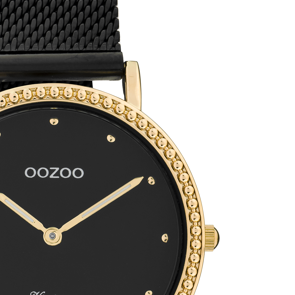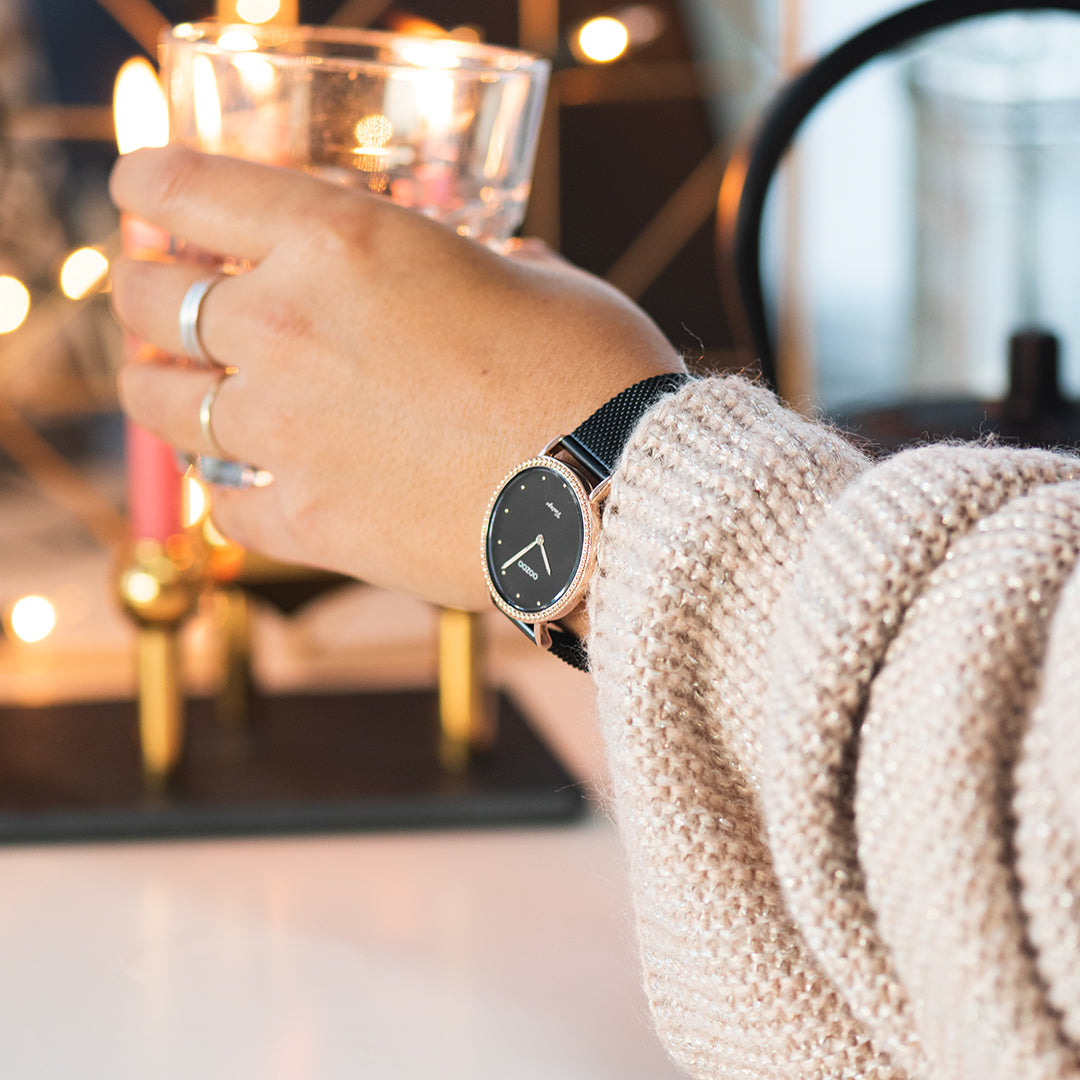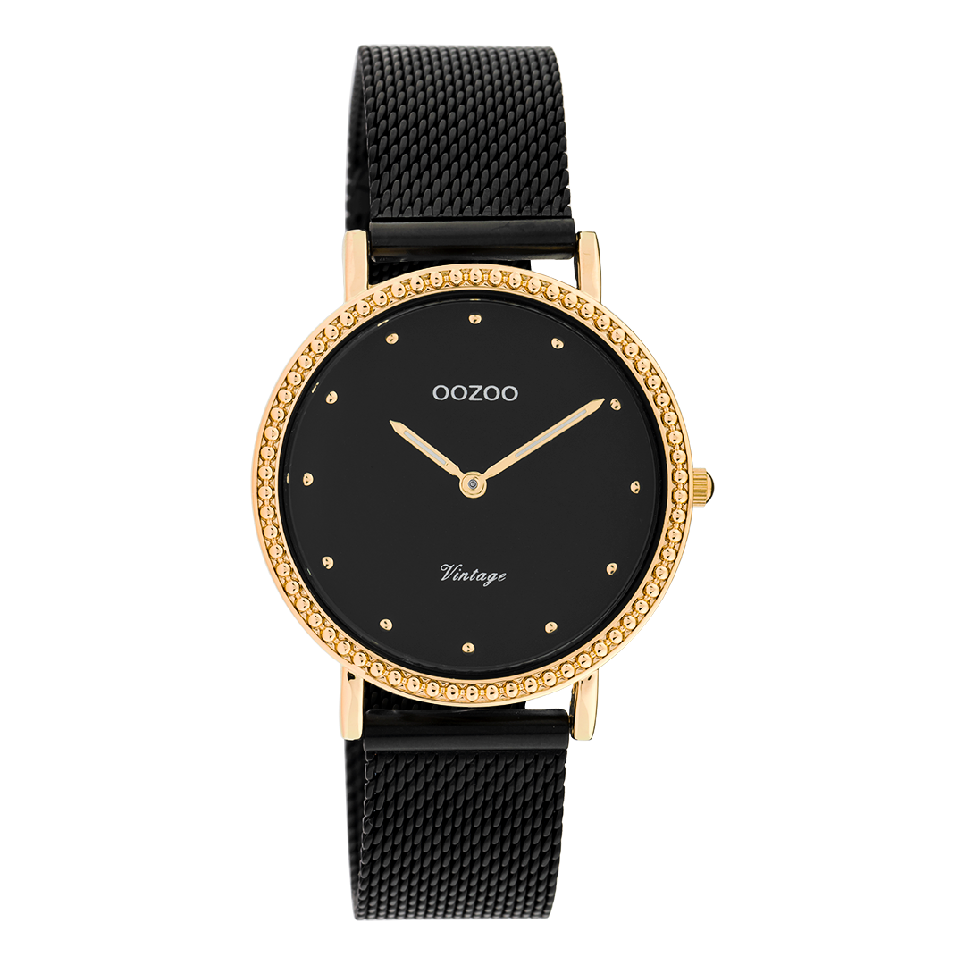 The classic look stays key in this trendy series and therefore, this round OOZOO vintage design with a playful wink is the season must-have! This ladies watch is the perfect combination of fashion and comfort with its 34 mm rose gold coloured metal watch case and black dial. The matte black metal mesh bracelet makes this watch a trendy accessory, which you can wear every day. The dial has rose gold coloured dots digits and matching hands. The C20059 adds the sparkle to your outfit. The mineral glass lays in a 6,9 mm slim metal watch case with IP-plating. This design has a stainless steel backplate and is nickel safe. This watch has a 2 Japanese movement and is covered by a 2 year warranty (see section 3 of our Refund, shipping & warranty policy).
