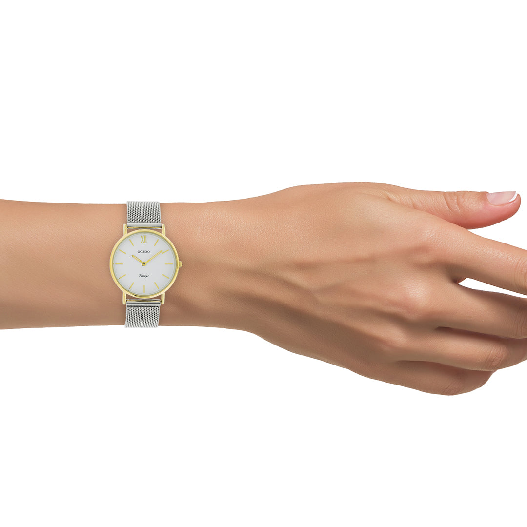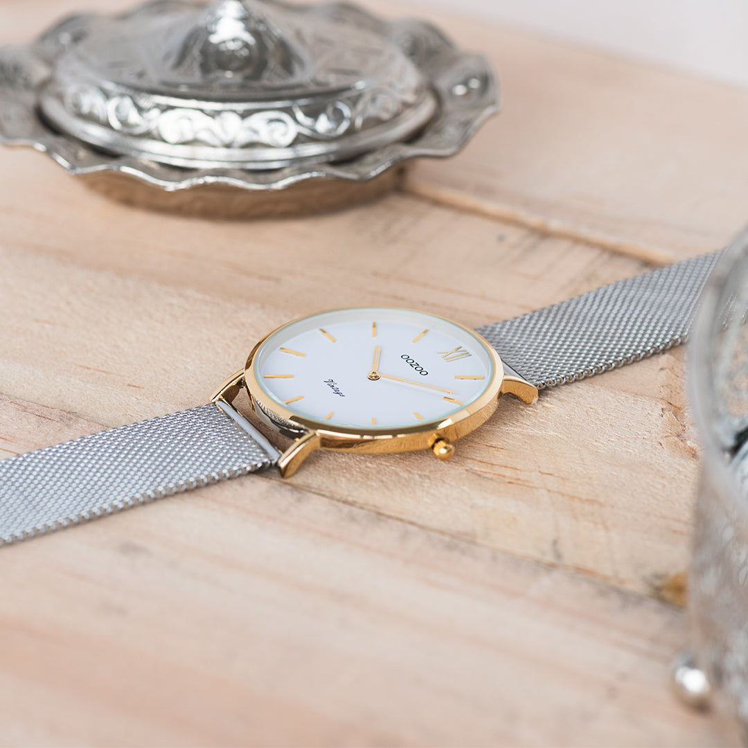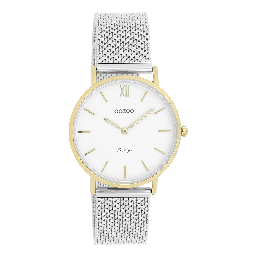 The classic look stays key in this trendy series and therefore, this round OOZOO vintage design with a playful wink is the season must-have! This unisex watch is the perfect combination of fashion and comfort with its 32 mm gold coloured metal watch case and white dial. The silver coloured metal mesh bracelet makes this watch a trendy accessory, which you can wear every day. The dial has gold coloured stripes digits and matching hands. The C20121 adds the sparkle to your outfit. The mineral glass lays in a 6,9 mm slim metal watch case with IP-plating. This design has a stainless steel backplate and is nickel safe. This watch has a 2 Japanese movement and is covered by a 2 year warranty (see section 3 of our Refund, shipping & warranty policy).