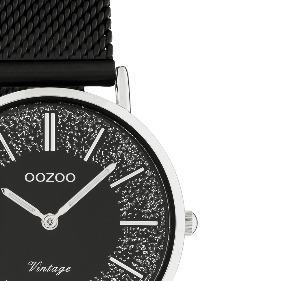 The classic look stays key in this trendy series and therefore, this round OOZOO vintage design with a playful wink is the season must-have! This ladies watch is the perfect combination of fashion and comfort with its 32 mm silver coloured metal watch case and black with sparkles dial. The black metal mesh bracelet makes this watch a trendy accessory, which you can wear every day. The dial has silver coloured stripes digits and matching hands. The C20141 adds the sparkle to your outfit. The mineral glass lays in a 6,9 mm slim metal watch case with IP-plating. This design has a stainless steel backplate and is nickel safe. This watch has a 2ATM Japanese movement and is covered by a 2 year warranty (see section 3 of our Refund, shipping & warranty policy).
