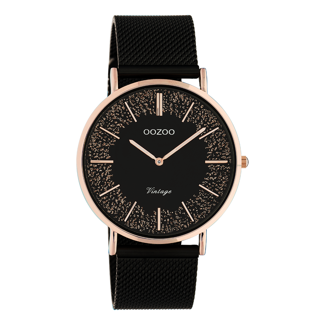 The classic look stays key in this trendy series and therefore, this round OOZOO vintage design with a playful wink is the season must-have! This ladies watch is the perfect combination of fashion and comfort with its 40 mm rose gold coloured metal watch case and black sparkling dial. The black metal mesh bracelet makes this watch a trendy accessory, which you can wear every day. The dial has rose gold coloured stripes digits and matching hands. The C20142 adds the sparkle to your outfit. The mineral glass lays in a 6,9 mm slim metal watch case with IP-plating. This design has a stainless steel backplate and is nickel safe. This watch has a 2 Japanese movement and is covered by a 2 year warranty (see section 3 of our Refund, shipping & warranty policy).