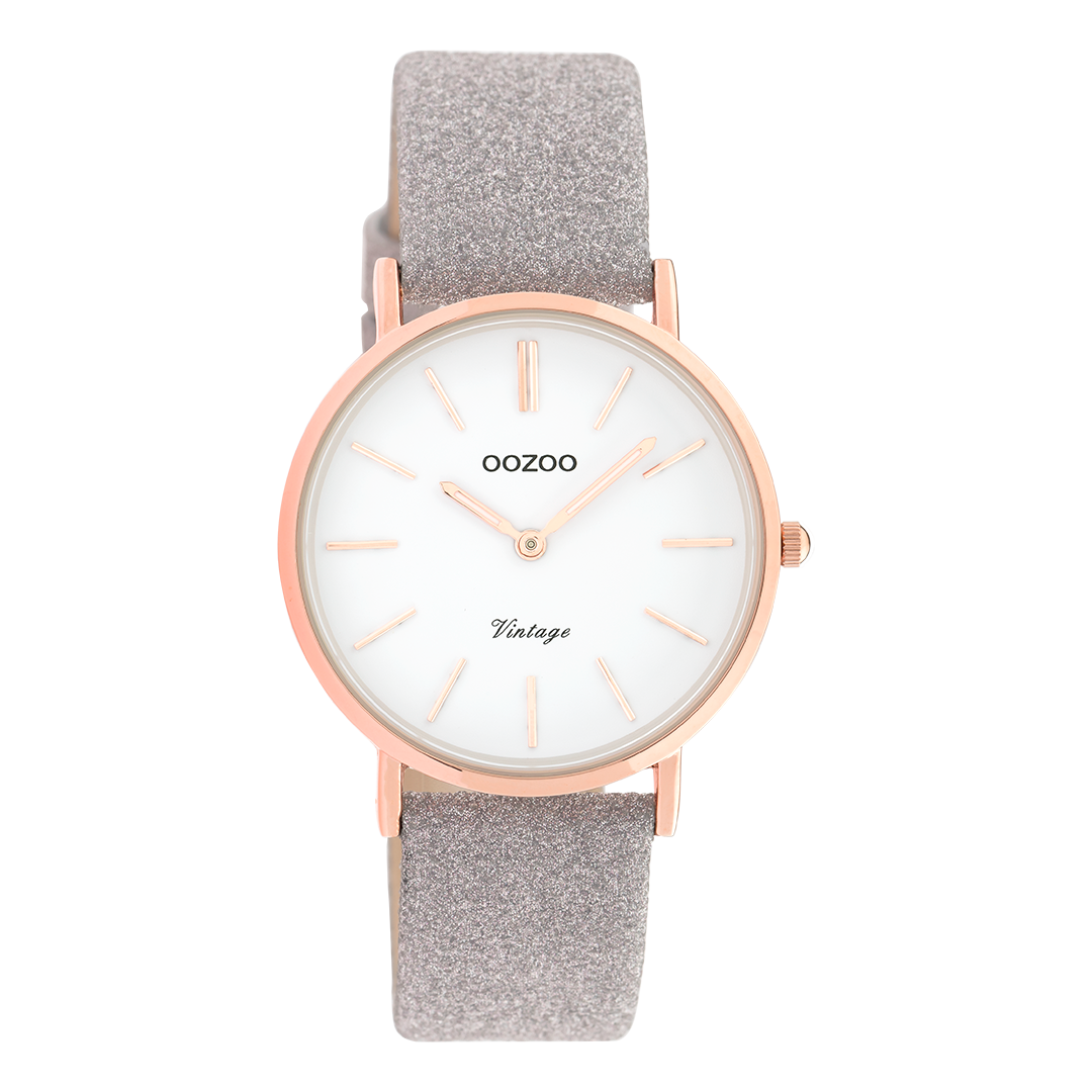 The classic look stays key in this trendy series and therefore, this round OOZOO vintage design with a playful wink is the season must-have! This unisex watch is the perfect combination of fashion and comfort with its 32 mm rose gold coloured metal watch case and white dial. The glitter taupe leather strap makes this watch a trendy accessory, which you can wear every day. The dial has rose gold coloured stripes digits and matching hands. The C20158 adds the sparkle to your outfit. The mineral glass lays in a 6,9 mm slim metal watch case with IP-plating. This design has a stainless steel backplate and is nickel safe. This watch has a 2 Japanese movement and is covered by a 2 year warranty (see section 3 of our Refund, shipping & warranty policy).