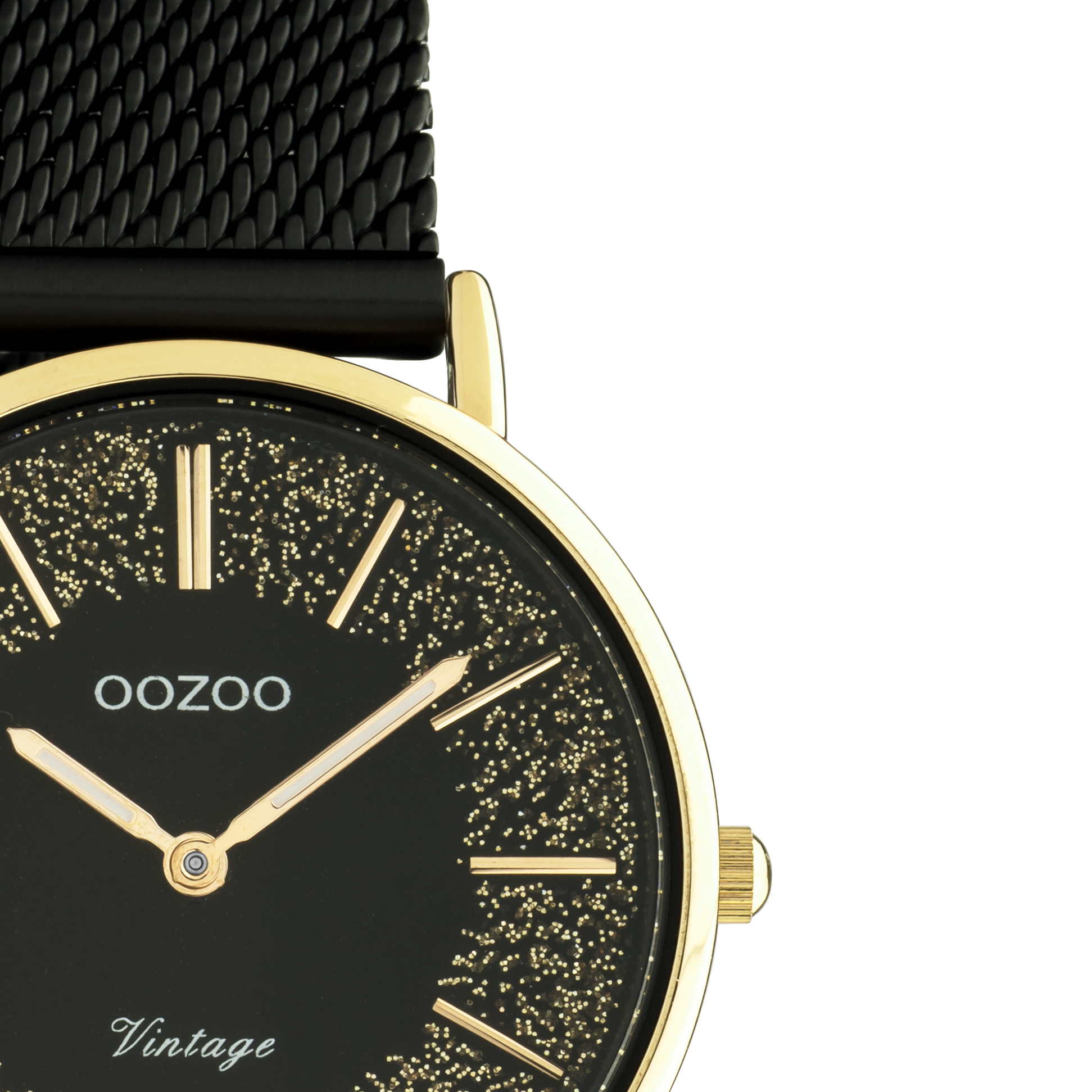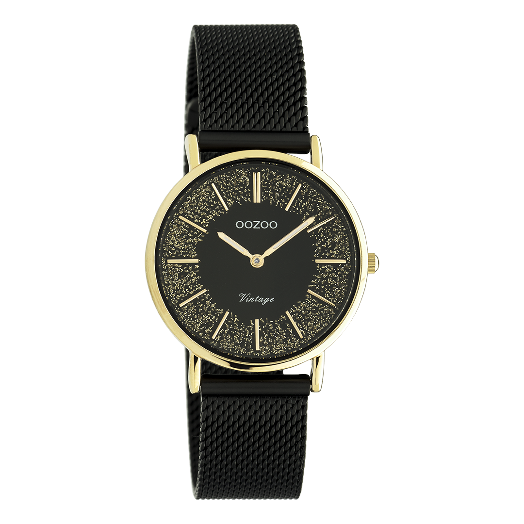The classic look stays key in this trendy series and therefore, this round OOZOO vintage design with a playful wink is the season must-have! This ladies watch is the perfect combination of fashion and comfort with its 32 mm gold coloured metal watch case and black with glitter dial. The black metal mesh bracelet makes this watch a trendy accessory, which you can wear every day. The dial has gold coloured stripes digits and matching hands. The C20189 adds the sparkle to your outfit. The mineral glass lays in a 6,9 mm slim metal watch case with IP-plating. This design has a stainless steel backplate and is nickel safe. This watch has a 2 Japanese movement and is covered by a 2 year warranty (see section 3 of our Refund, shipping & warranty policy).