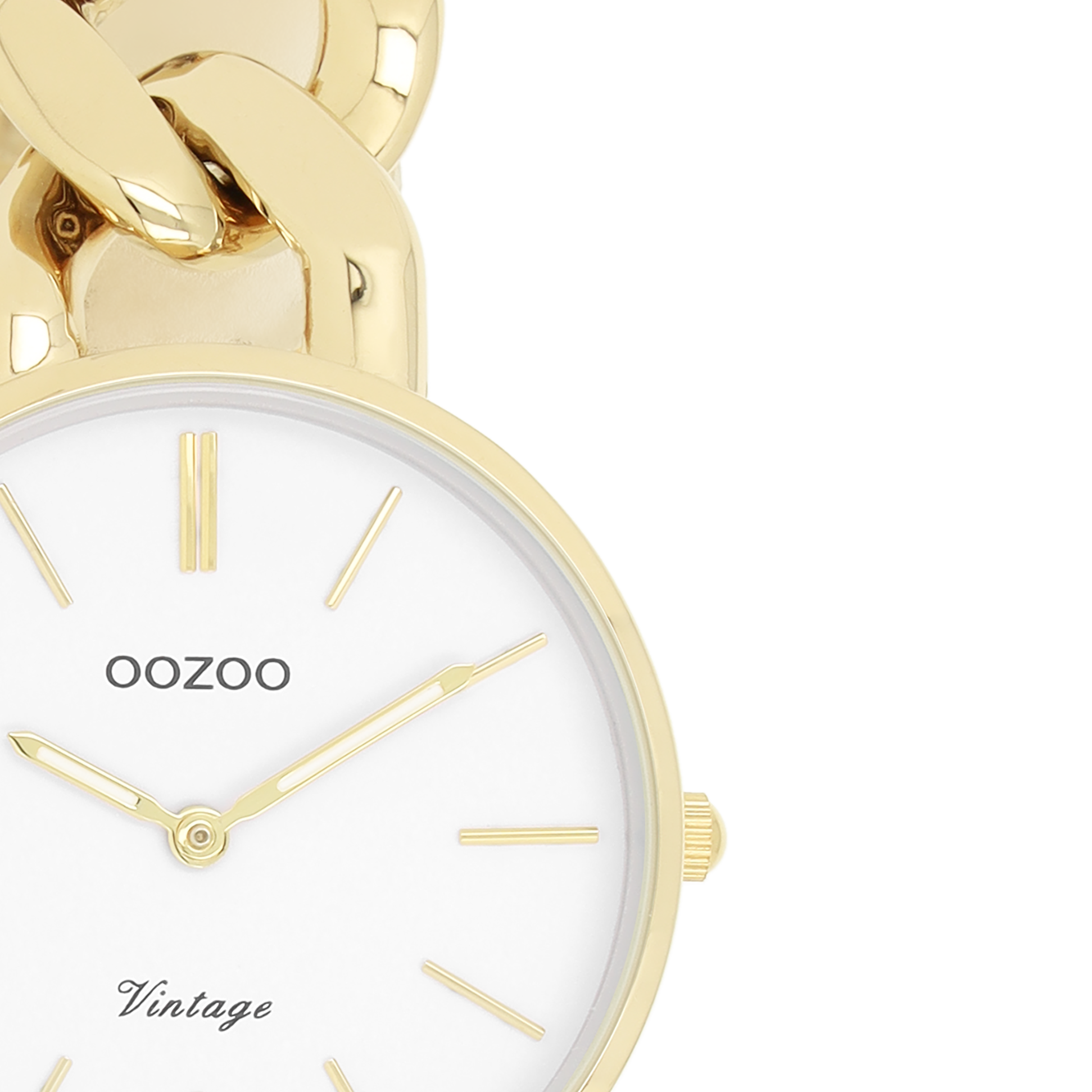 The classic look stays key in this trendy series and therefore, this round OOZOO vintage design with a playful wink is the season must-have! This ladies watch is the perfect combination of fashion and comfort with its 32 mm gold coloured metal watch case and blanc dial. The gold coloured chunky chain bracelet makes this watch a trendy accessory, which you can wear every day. The dial has gold coloured stripes digits and matching hands. The C20357 adds the sparkle to your outfit. The mineral glass lays in a 6,9 mm slim metal watch case with IP-plating. This design has a stainless steel backplate and is nickel safe. This watch has a 2ATM Japanese movement and is covered by a 2 year warranty (see section 3 of our Refund, shipping & warranty policy).