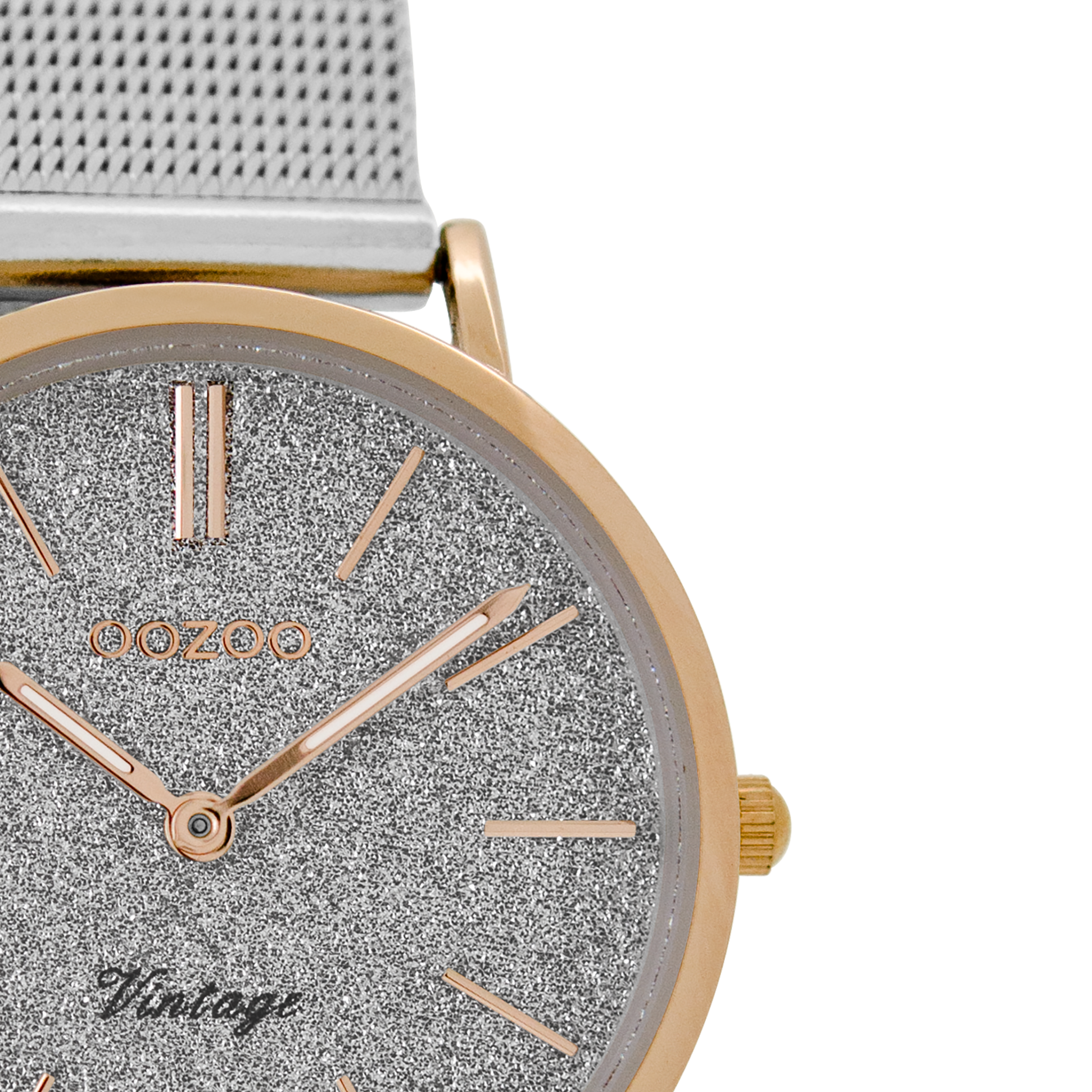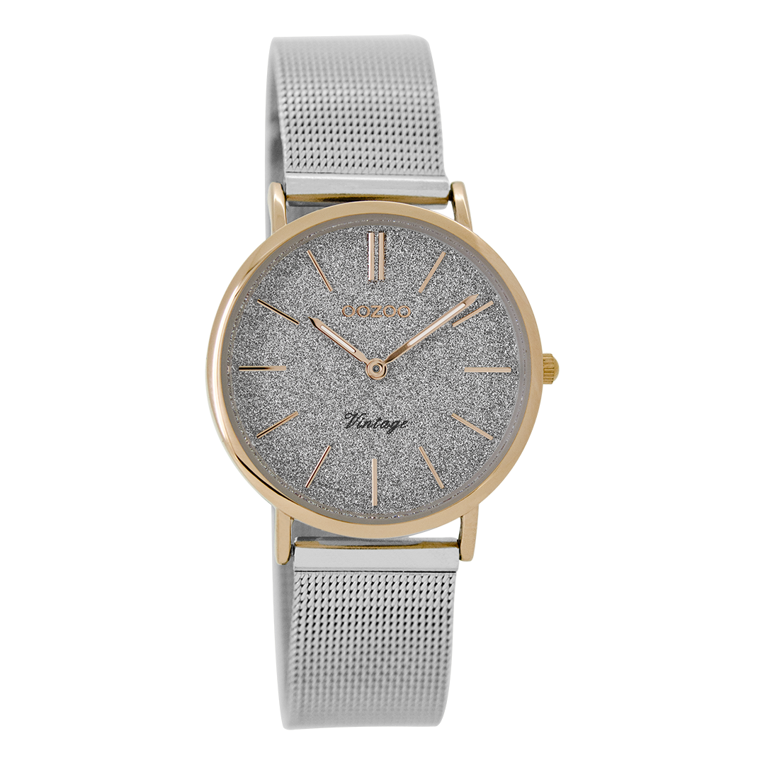The classic look stays key in this trendy series and therefore, this round OOZOO vintage design with a playful wink is the season must-have! This ladies watch is the perfect combination of fashion and comfort with its 32 mm rose gold coloured metal watch case and silver coloured glitter dial. The silver coloured metal mesh bracelet makes this watch a trendy accessory, which you can wear every day. The dial has rose gold coloured stripes digits and matching hands. The C8838 adds the sparkle to your outfit. The mineral glass lays in a 6,9 mm slim metal watch case with IP-plating. This design has a stainless steel backplate and is nickel safe. This watch has a 2 Japanese movement and is covered by a 2 year warranty (see section 3 of our Refund, shipping & warranty policy).