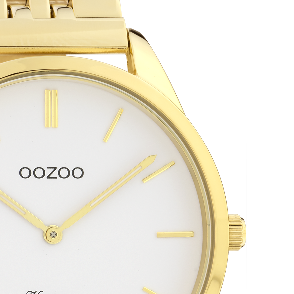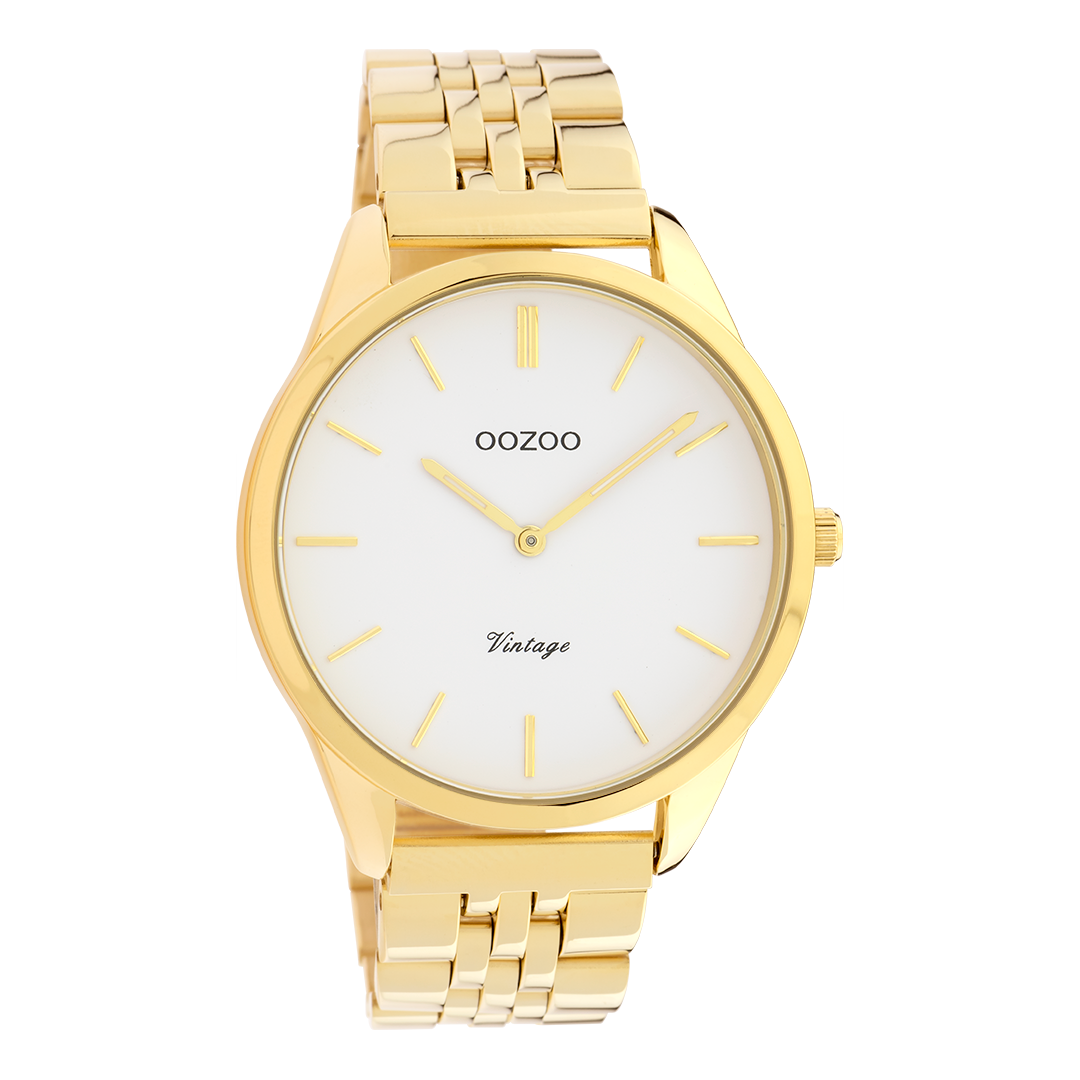 The classic look stays key in this trendy series and therefore, this round OOZOO vintage design with a playful wink is the season must-have! This unisex watch is the perfect combination of fashion and comfort with its 38 mm gold coloured metal watch case and white dial. The gold coloured stainless steel bracelet makes this watch a trendy accessory, which you can wear every day. The dial has gold coloured stripes digits and matching hands. The C9985 adds the sparkle to your outfit. The mineral glass lays in a 6,9 mm slim metal watch case with IP-plating. This design has a stainless steel backplate and is nickel safe. This watch has a 2 Japanese movement and is covered by a 2 year warranty (see section 3 of our Refund, shipping & warranty policy).