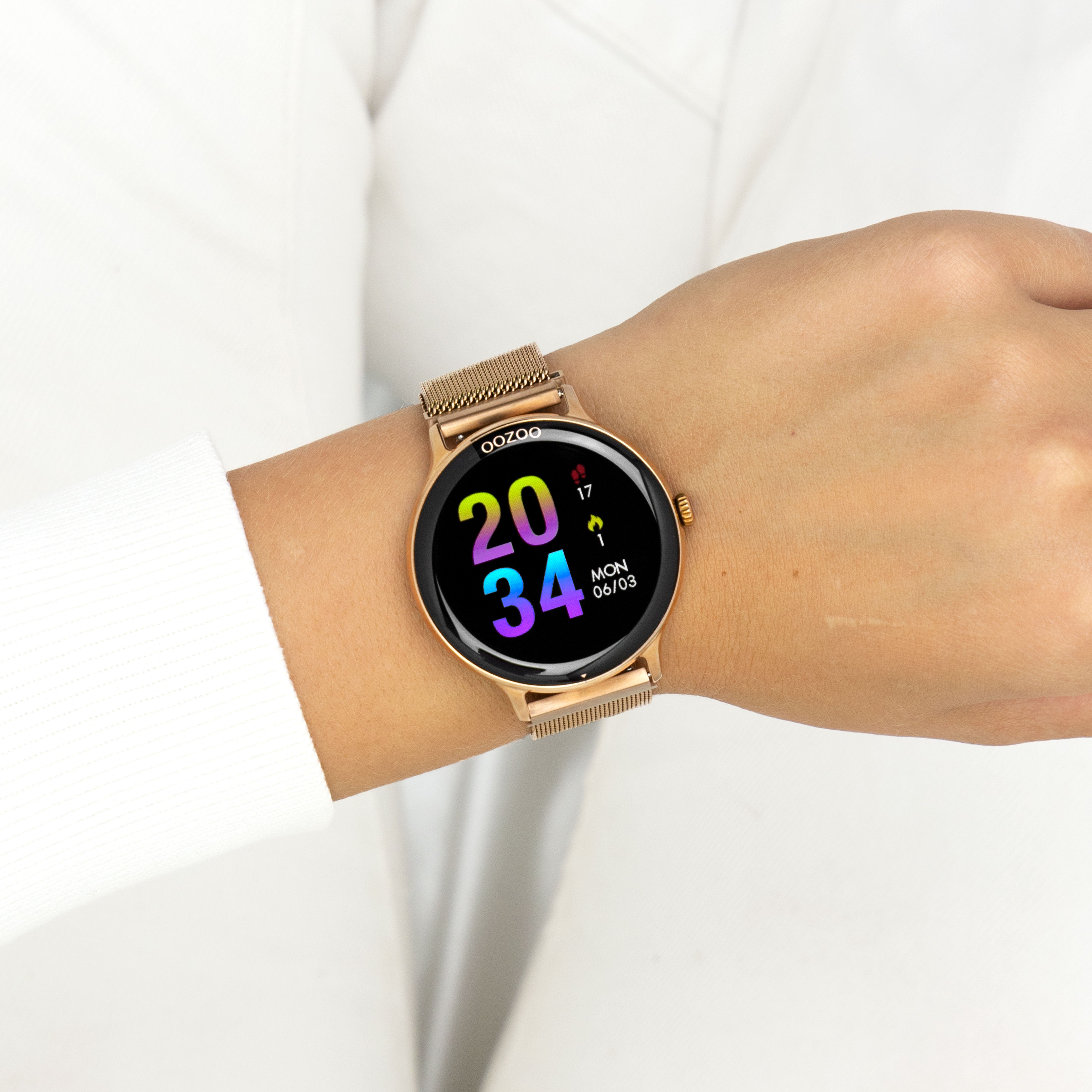 Get smart with us! This unisex smartwatch from OOZOO's digital collection has a round watch case. The Q00138 is one of our most elegant designs in our OOZOO Smartwatches collection with its 45 mm rose gold coloured metal watch case. This essential accessory has a beautiful magnetic rose gold coloured metal mesh bracelet with rose gold coloured clasp. This smartwatch has different styles of colorful digital OOZOO dials to choose or make your own unique creation for its full touch screen. The mineral glass lays in a 12 mm thick watch case and has a plastic backplate and is nickel safe. A charger is included with this product. This smartwatch is IP67 certified and is covered by a 2 year warranty (see section 3 of our Refund, shipping & warranty policy).