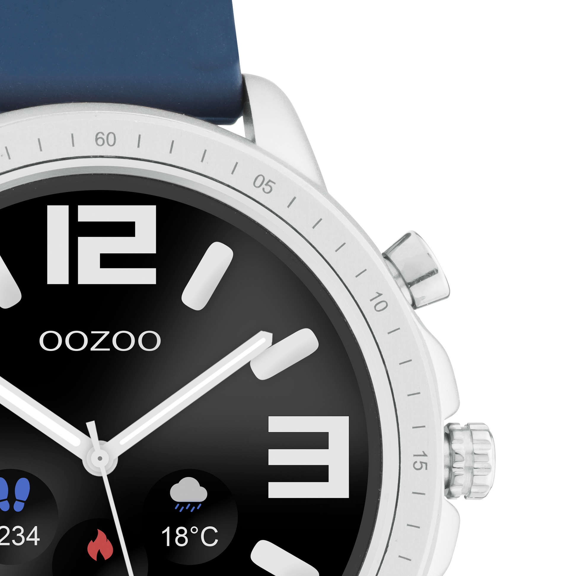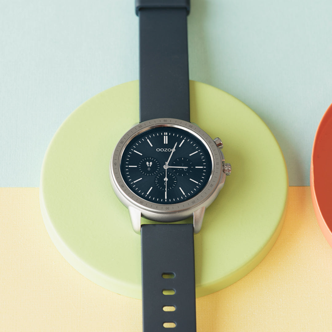 Get smart with us! This unisex smartwatch from OOZOO's digital collection has a round watch case. The Q00315 is one of our most elegant designs in our OOZOO Smartwatches collection with its 45 mm silver coloured metal watch case. This essential accessory has a beautiful matte dark blue rubber strap with clasp. This smartwatch has different styles of colorful digital OOZOO dials to choose or make your own unique creation for its full touch screen. The mineral glass lays in a 11,4 mm thick watch case and has a plastic backplate and is nickel safe. A charger is included with this product. This smartwatch is IP67 certified and is covered by a 2 year warranty (see section 3 of our Refund, shipping & warranty policy).