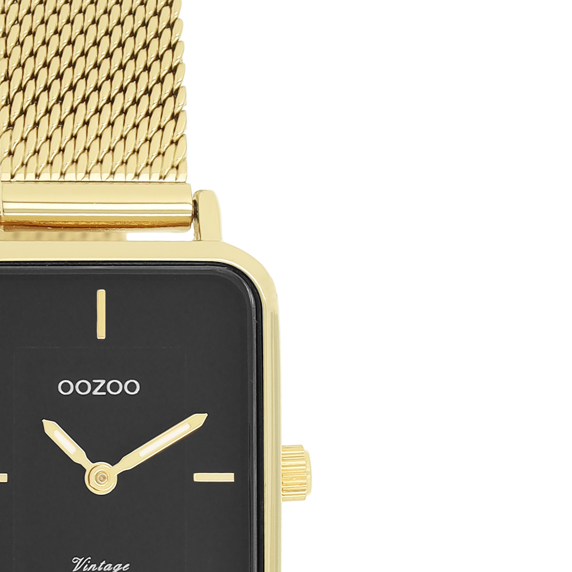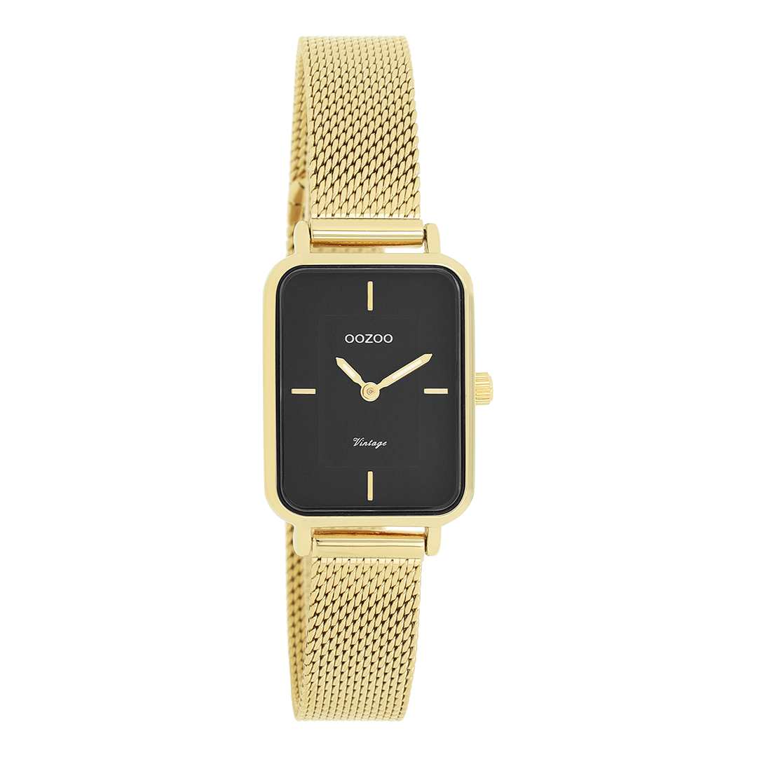 The classic look stays key in this trendy series and therefore, this rectangle OOZOO vintage design with a playful wink is the season must-have! This ladies watch is the perfect combination of fashion and comfort with its 24x28 mm gold coloured metal watch case and noir dial. The gold coloured metal mesh bracelet makes this watch a trendy accessory, which you can wear every day. The dial has gold coloured stripes digits and matching hands. The C20354 adds the sparkle to your outfit. The mineral glass lays in a 6,9 mm slim metal watch case with IP-plating. This design has a stainless steel backplate and is nickel safe. This watch has a 2ATM Japanese movement and is covered by a 2 year warranty (see section 3 of our Refund, shipping & warranty policy).