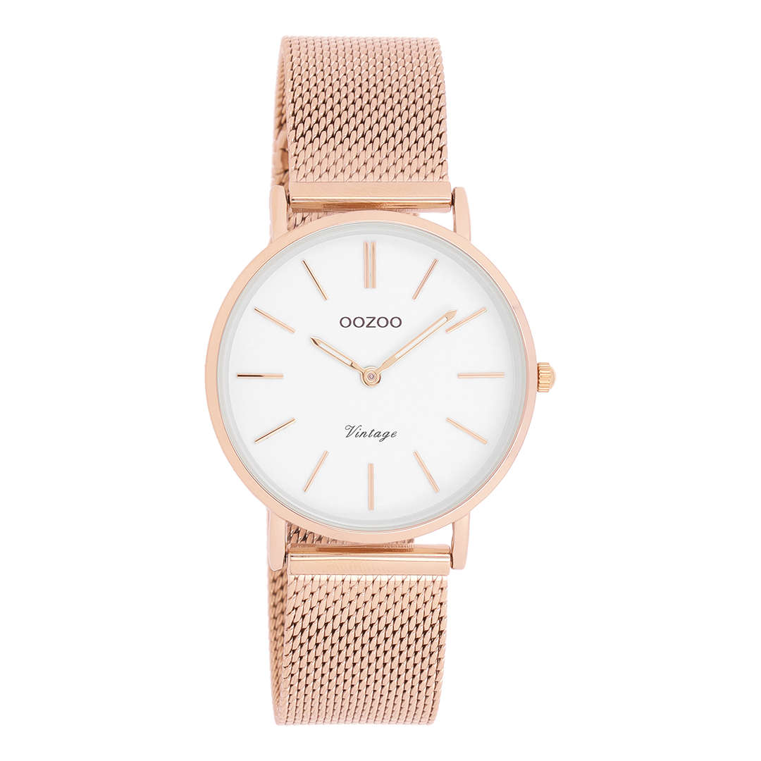 Sophistication and elegance are two elements of our beautiful OOZOO Vintage Classics. This classic round design with a contemporary twist is something for everyone. This unisex watch is the perfect combination of comfort and fashion with its 32 mm rose coloured metal watch case and white dial. The rose coloured metal mesh bracelet makes this watch an all-time classic which you can wear with every occasion. The dial has rose coloured stripes digits and matching hands. The C9919 is a must have for your every-wear. The mineral glass lays in a 6,9 mm slim metal watch case with IP-plating. This design has a stainless steel backplate and is nickel safe. This watch has a 2ATM Japanese movement and is covered by a 2 year warranty (see section 3 of our Refund, shipping & warranty policy).